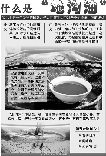 研究表明,長期攝入地溝油會對人體造成明顯傷害,如發(fā)育障礙、易患腸炎,并有肝、心和腎腫大以及脂肪肝等病變。而地溝油中的主要危害物之一黃曲霉素是一種強(qiáng)烈的致癌物質(zhì),其毒性是砒霜的100倍。另一個問題是倫理上的,別人吃過的油,在下水道里變質(zhì),再撈上來,你能吃得下去嗎? 那么,有沒有一種簡便的方法,可以鑒別地溝油呢?我們不妨聽聽食品科學(xué)專家和業(yè)內(nèi)人士怎么說。 1、科學(xué)鑒別地溝油 目前沒有好辦法 在一個注重食品安全的時代,理想的狀態(tài)是,你下館子,隨手掏出一張試紙浸到菜里,過一會兒拿出來跟譜表比比,然后大叫:“掌柜的,換油!” 2、傳統(tǒng)的檢測方法 都有一定局限性 在科研工作者看來,治理地溝油的難點在于,經(jīng)過洗滌、蒸餾、脫色、脫臭等精煉過程后,單從外觀和感官上,很難區(qū)分地溝油和普通油。不法商販還會把地溝油摻入食用油中,如果含量較少,更是難以檢測。 3、鑒別地溝油 冰箱顯身手? 曾在北京多家大酒樓擔(dān)任總廚、高管的特級廚師馮鵬說,一般情況下,地溝油和普通油無法區(qū)分,進(jìn)貨時難免上當(dāng)。他只能通過實踐來判斷:飯館炒菜之前一般要先過油,在這道“滑油”工序中,好油可反復(fù)使用七八次,而地溝油最多使用三次就會變黏,而且有哈喇味兒。 “另外,室外溫度較低時,地溝油會像棕櫚油一樣凝固,所以常有人用地溝油冒充棕櫚油。”馮鵬說,冬天可以據(jù)此鑒別地溝油,夏天則可通過冰箱來檢驗。一些媒體認(rèn)為地溝油有味道,可以聞出來,此外里面含水多,下鍋會爆響,馮鵬認(rèn)為這些都是無稽之談,因為水根本摻不進(jìn)油中,且地溝油也沒什么異味。 4、我們該如何 鑒別地溝油? 一看。看透明度,純凈的植物油呈透明狀,在生產(chǎn)過程中由于混入了堿脂、蠟質(zhì)、雜質(zhì)等物,透明度會下降;看色澤,純凈的油為無色,在生產(chǎn)過程中由于油料中的色素溶于油中,油才會帶色;看沉淀物,其主要成分是雜質(zhì)。 二聞。每種油都有各自獨(dú)特的氣味。可以在手掌上滴一兩滴油,雙手合攏摩擦,發(fā)熱時仔細(xì)聞其氣味。有異味的油,說明質(zhì)量有問題,有臭味的很可能就是地溝油;若有礦物油的氣味更不能買。 三嘗。用筷子取一滴油,仔細(xì)品嘗其味道。口感帶酸味的油是不合格產(chǎn)品,有焦苦味的油已發(fā)生酸敗,有異味的油可能是地溝油。 四聽。取油層底部的油一兩滴,涂在易燃的紙片上,點燃并聽其響聲。燃燒正常無響聲的是合格產(chǎn)品;燃燒不正常且發(fā)出“吱吱”聲音的,水分超標(biāo),是不合格產(chǎn)品;燃燒時發(fā)出“噼啪”爆炸聲,表明油的含水量嚴(yán)重超標(biāo),而且有可能是摻假產(chǎn)品,絕對不能購買。 五問。問商家的進(jìn)貨渠道,必要時索要進(jìn)貨發(fā)票或查看當(dāng)?shù)厥称沸l(wèi)生監(jiān)督部門抽樣檢測報告。 |