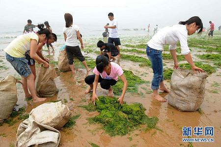 6月29日,在青島第六海水浴場,幾位到此游玩的大學生自發參加清理滸苔。