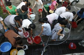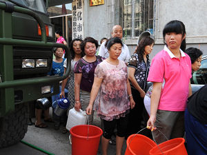 自7月31日被洪水沖斷自來水輸水管線至今,吉林省通化市全市停水已經(jīng)超過48小時,市區(qū)33萬人面臨用水難題。消防部門和城建部門調(diào)運25臺送水車,循環(huán)給居民送水,通化市隨處可見提著水桶找水的市民.
